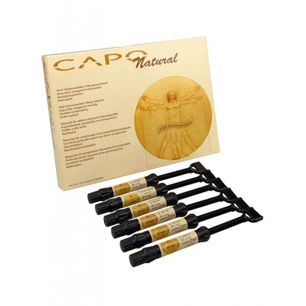 Capo – светоотверждаемый , микрогибридный композитный материал, содержащий ультра-мелкий, рентгеноконтрастный стекло-керамический наполнитель. Применяется для всех видов реставраций зубов, а также может быть использован лабораторно. Всегда используется с адгезивной техникой. Материал легко полируется до высокой степени блеска и долго его сохраняет. Обладает истинным эффектом «хамелеона», что значительно улучшает цветовую адаптацию на границе пломба – зуб, при этом не происходит смещения цвета в серую сторону.